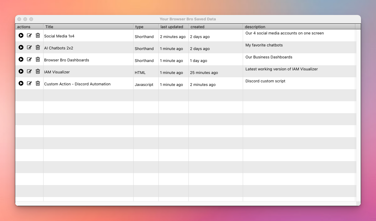 I use Browser Bro almost every day and multiple times a week for 3- or 4 different things. It is my go to tool for viewing AI output such as formatted text or JavaScript code. I built it because I needed its functionality for my own work, time-saving automations, and monitoring convenience.